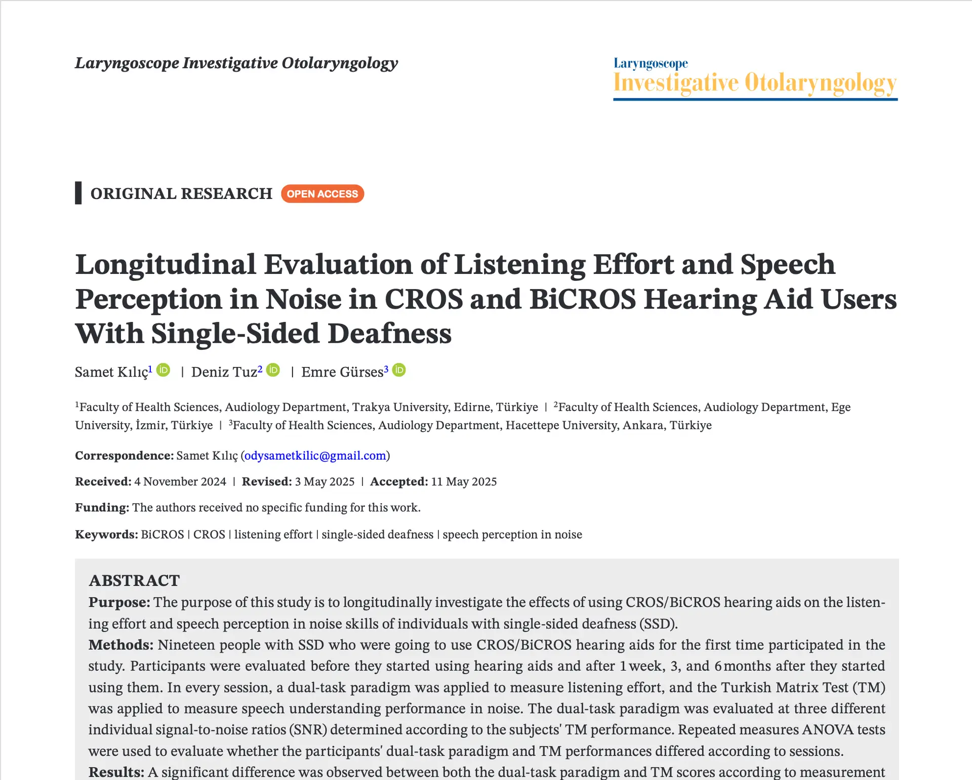 Dr.Öğr.Üyesi Samet KILIÇ, Dr.Öğr.Üyesi Emre GÜRSES ve Dr.Öğr.Üyesi Deniz TUZ tarafından yürütülen güncel araştırma, “Longitudinal Evaluation of Listening Effort and Speech Perception in Noise in CROS and BiCROS Hearing Aid Users With Single-Sided Deafness” başlığıyla bilim dünyasıyla buluştu!